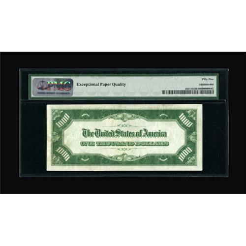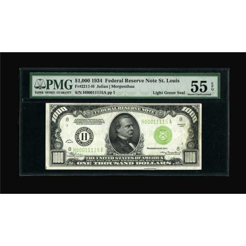 <B>Fr. 2211-H $1000 1934 Light Green Seal Federal Reserve Note. PMG About Uncirculated 55 EPQ.</B></I><BR> Plenty of embossing remains on this bright note with a fancy serial number..<BR><BR><b>Shipping:</b> Coins & Currency (<a target="_blank" href="http://www.heritageauctions.com/common/shipping.php">view shipping information</a>)