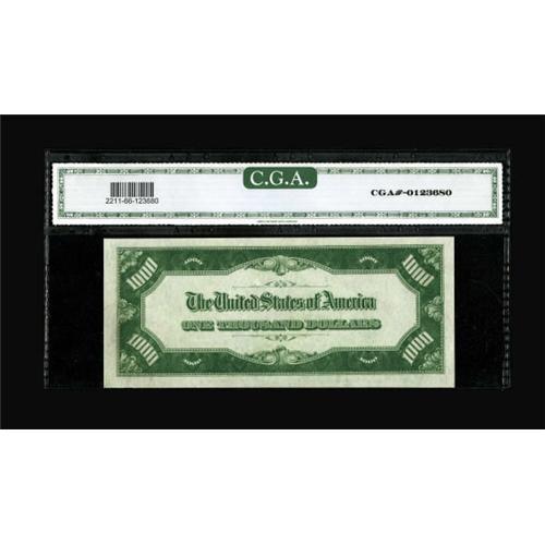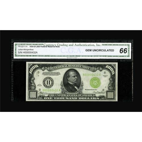 <B>Fr. 2211-H $1000 1934 Light Green Seal Federal Reserve Note. CGA Gem Uncirculated 66.</B></I><BR> The colors are bright for this three digit serial number issue which had a touch over 22,000 notes printed.<BR><BR><b>Shipping:</b> Coins & Currency (<a target="_blank" href="http://www.heritageauctions.com/common/shipping.php">view shipping information</a>)