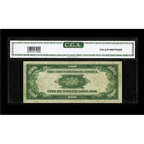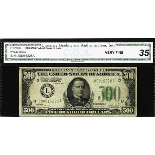 <B>Fr. 2200-L $500 1928 Federal Reserve Note. CGA Very Fine 35.</B></I><BR>This early high denomination note from San Francisco is well preserved though there are some light stains visible.