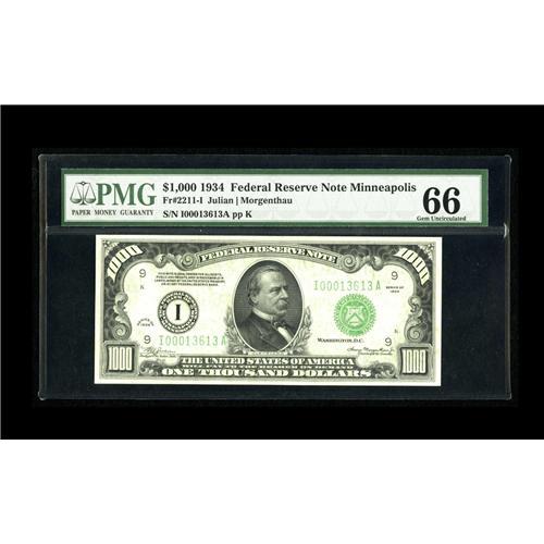 <B>Fr. 2211-I $1000 1934 Federal Reserve Note. PMG Gem Uncirculated 66EPQ.</B></I><BR>Minneapolis is an extremely scarce district, with a print run of only 12,000 examples in this series. Tonight's offering is particularly nice, with fresh paper, well balanced margins and full color. Expect to make a strong bid to add this beautiful piece to your collection.<BR><BR><b>Shipping:</b> Coin/Currency (<a target="_blank" href="http://www.heritageauctions.com/common/shipping.php">view shipping information</a>)