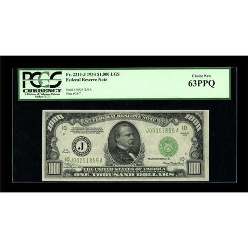 <B>Fr. 2211-J $1000 1934 Federal Reserve Note. PCGS About New 50PPQ.</B></I><BR> The holder lists this note as a Light Green Seal, but it is the Dark Green Seal variety. It's a bright Kansas City representative that is heavily embossed.<BR><BR><b>Shipping:</b> Coins & Currency (<a target="_blank" href="http://www.heritageauctions.com/common/shipping.php">view shipping information</a>)