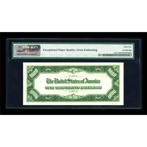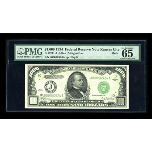 <B>Fr. 2211-J $1000 1934 Mule Federal Reserve Note. PMG Gem Uncirculated 65 EPQ.</B></I><BR> The accolades received by this Kansas City note are tremendous, as PMG notes "exceptional paper quality, great embossing." This cataloger sees no reason to disagree. It's one of the finer examples we have had the pleasure of offering.<BR><BR><b>Shipping:</b> Coins & Currency (<a target="_blank" href="http://www.heritageauctions.com/common/shipping.php">view shipping information</a>)