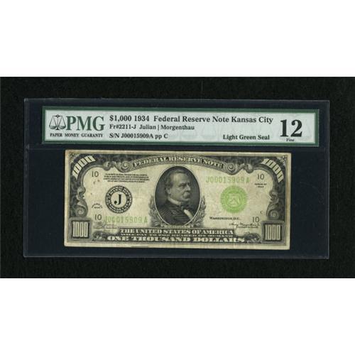 <B>Fr. 2211-J $1000 1934 Light Green Seal Federal Reserve Note. PMG Fine 12.</B></I><BR> PMG has commented about some rust on this average circulated note.<BR><BR><b>Shipping:</b> Coins & Currency (<a target="_blank" href="http://www.heritageauctions.com/common/shipping.php">view shipping information</a>)