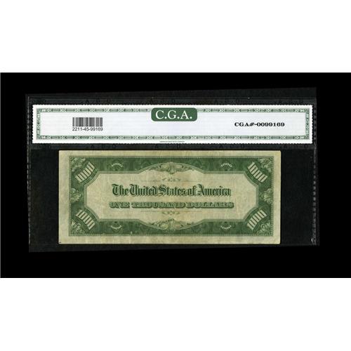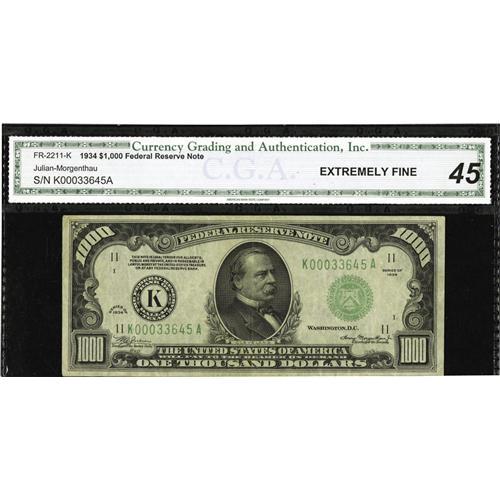 <B>Fr. 2211-K $1000 1934 Federal Reserve Note. CGA Extremely Fine 45.</B></I><BR>Edges look solid through the holder on this lightly circulated Dallas high denomination.