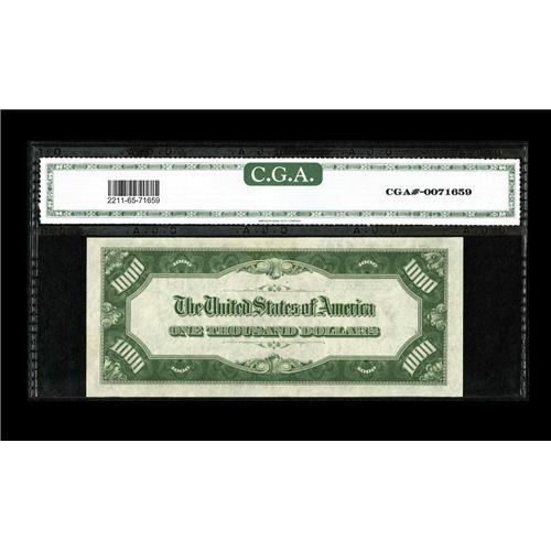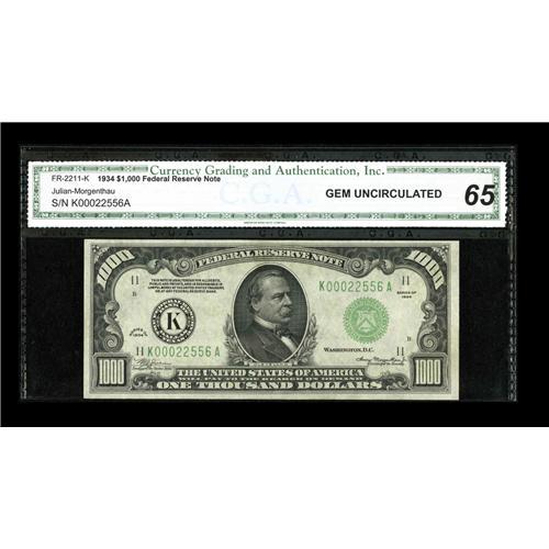 <B>Fr. 2211-K $1000 1934 Federal Reserve Note. CGA Gem Uncirculated 65.</B></I><BR>Dallas is the key district in the 1934 $1000 series, with uncirculated examples almost impossible to find. This piece has been graded and encapsulated by CGA, earning the Gem Uncirculated 65 designation. Expect some spirited competition from knowledgeable collectors who have been searching for a 1934 Dallas thousand in the ultimate grade for quite some time.