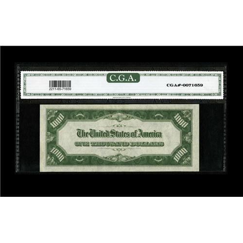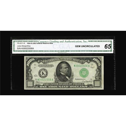 <B>Fr. 2211-K $1000 1934 Federal Reserve Note. CGA Gem Uncirculated 65.</B></I><BR>Dallas is the key district in the 1934 $1000 series, with uncirculated examples almost impossible to find. This piece has been graded and encapsulated by CGA, earning the Gem Uncirculated 65 designation. Expect some spirited competition from knowledgeable collectors who have been searching for a 1934 Dallas thousand in the ultimate grade for quite some time.