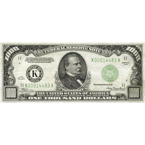 <B>Fr. 2211-K $1000 1934 Federal Reserve Note. Very Fine-Extremely Fine.</B></I><BR>This wide margined Dallas $1000 looks to be of a higher grade at first glance.
