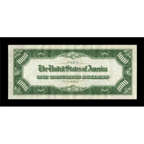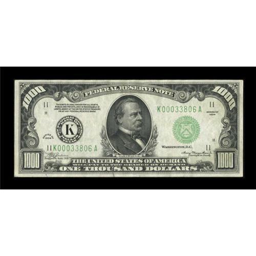 <B>Fr. 2211-K $1000 1934 Federal Reserve Note. Very Fine.</B></I><BR> Embossing of the district seal, treasury seal, and serial numbers is still evident on this wholly original note. There are two too many folds for a full EF grade, though we would not be surprised to see an EF price realized here tonight. Two minor pinholes are noted, but are visible only when the note is backlit.<BR><BR><b>Shipping:</b> Coins & Currency (<a target="_blank" href="http://www.heritageauctions.com/common/shipping.php">view shipping information</a>)