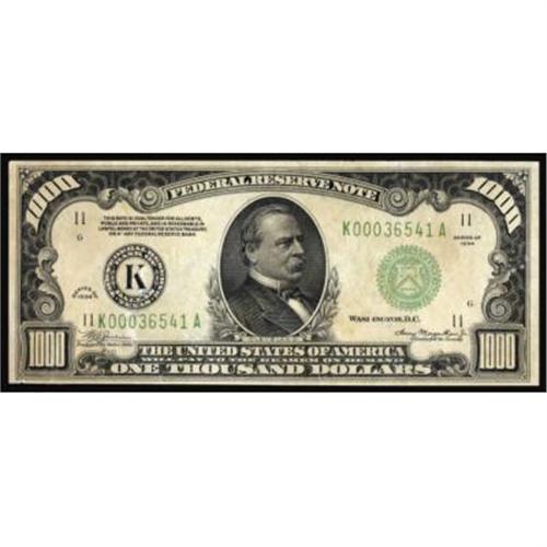 Fr. 2211-K. 1934 $1,000 Federal Reserve Note. CGA About Uncirculated 50.