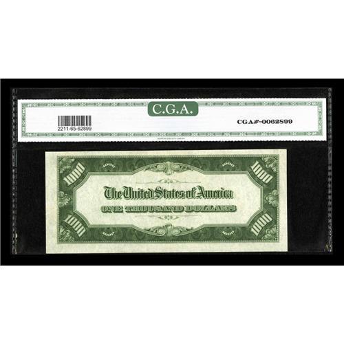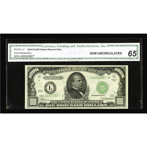 <B>Fr. 2211-L* $1000 1934 Federal Reserve Note. CGA Gem Uncirculated 65.</B></I><BR> Literally a dozen known examples of this scarce San Francisco star are known, this being the only CU in the census. The face margins are exceptional though one would wish for better on the back. Overall the appearance is exceptional and the paper bright.
