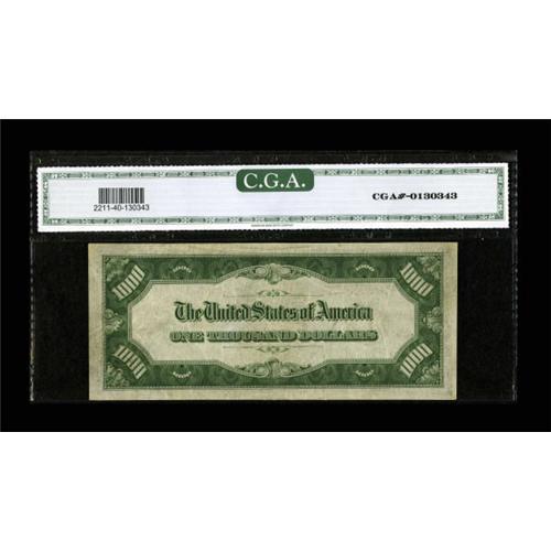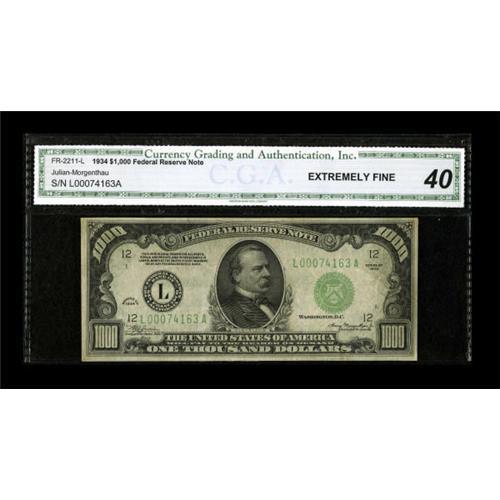 <B>Fr. 2211-L $1000 1934 Federal Reserve Note. CGA Extremely Fine 40.</B></I><BR> Solid margins are noted on this San Fran issue. According to the Schwartz and Lindquist reference, this piece is a newly recorded high serial number.<BR><BR><b>Shipping:</b> Coins & Currency (<a target="_blank" href="http://www.heritageauctions.com/common/shipping.php">view shipping information</a>)