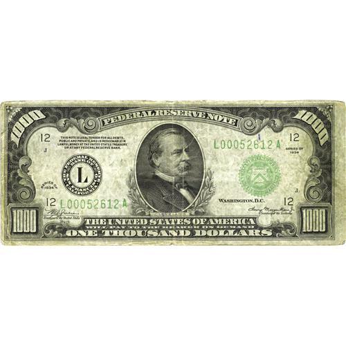 <B>Fr. 2211-L $1000 1934 Federal Reserve Note. Fine-Very Fine.</B></I><BR>The paper surfaces are original while a small blue ink mark is noticed on the face.