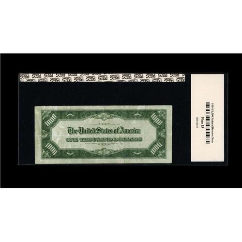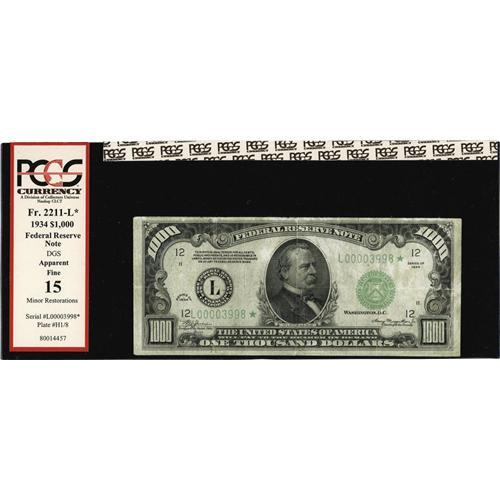 <B>Fr. 2211-L* $1000 1934 Federal Reserve Note. PCGS Apparent Fine 15.</B></I><BR>This note which is new to the census has undergone some minor restorations, but still remains a collectible example of a scarce issue.