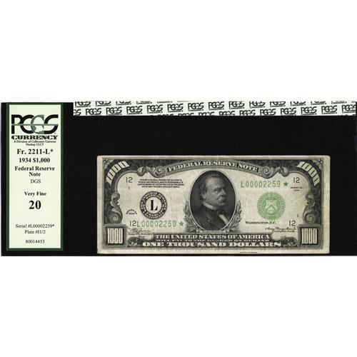 <B>Fr. 2211-L* $1000 1934 Federal Reserve Note. PCGS Very Fine 20.</B></I><BR>We are fortunate to offer another example of this scarce star. In this cataloger's opinion the note does appear to be a little bit better than the grade assigned on the holder. 2005 CSNS saw a Fine-Very Fine example go for $4800.