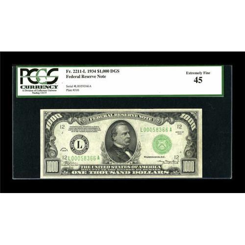 <B>Fr. 2211-L $1000 1934 Federal Reserve Note. PCGS Extremely Fine 45.</B></I><BR> In the holder, only two folds are immediately visible giving this note an overall AU appearance.<BR><BR><b>Shipping:</b> Coins & Currency (<a target="_blank" href="http://www.heritageauctions.com/common/shipping.php">view shipping information</a>)