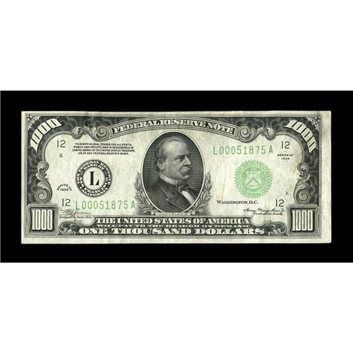 <B>Fr. 2211-L $1000 1934 Federal Reserve Note. Very Fine.</B></I><BR>Traces of embossing remain while a faint line is noticed to the right of the portrait.<BR><BR><b>Shipping:</b> Coin/Currency (<a target="_blank" href="http://www.heritageauctions.com/common/shipping.php">view shipping information</a>)