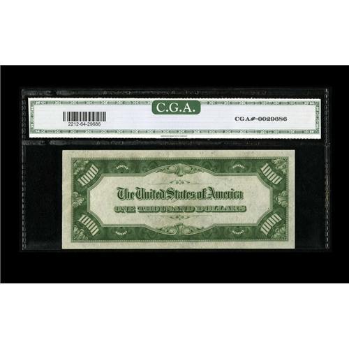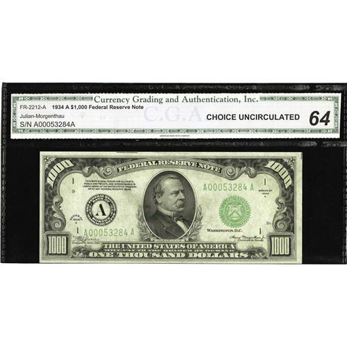 <B>Fr. 2212-A $1000 1934A Federal Reserve Note. CGA Choice Uncirculated 64.</B></I><BR>Natural paper wave and embossing are observed on this M-note from the tougher Boston district.