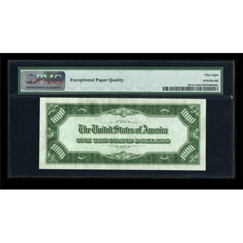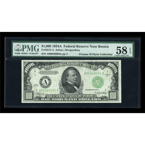<B>Fr. 2212-A $1000 1934A Federal Reserve Note. PMG Choice About Unc 58 EPQ.</B></I><BR> A well centered and fully embossed example. <BR><I>From The Thomas M. Flynn Collection</B></I><BR><BR><b>Shipping:</b> Coins & Currency (<a target="_blank" href="http://www.heritageauctions.com/common/shipping.php">view shipping information</a>)