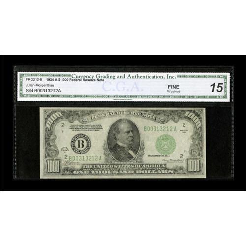<B>Fr. 2212-B $1000 1934A Federal Reserve Note. CGA Fine 15.</B></I><BR> Here is a note that has been washed. The back remains bright.<BR><BR><b>Shipping:</b> Coins & Currency (<a target="_blank" href="http://www.heritageauctions.com/common/shipping.php">view shipping information</a>)