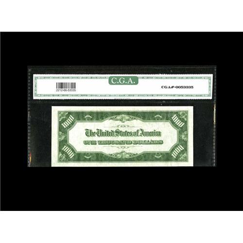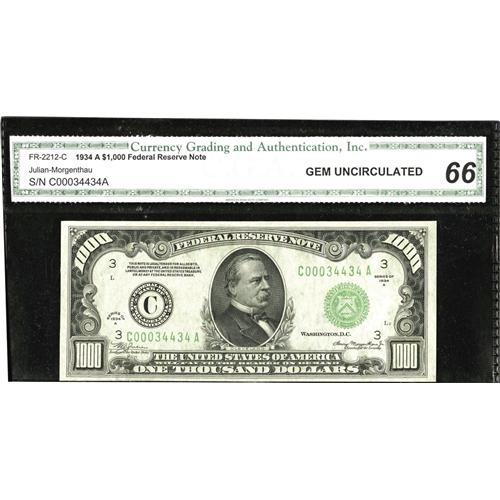 <B>Fr. 2212-C $1000 1934A Federal Reserve Note. CGA Gem Uncirculated 66.</B></I><BR>This is one of only several new examples from this district that we have recently offered at auction. An indication that this issue is tough in higher grade. Embossing is easily seen on crisp, white natural surfaces.