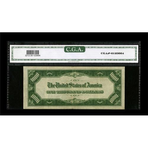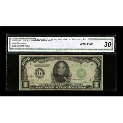 <B>Fr. 2212-D $1000 1934A Federal Reserve Note. CGA Very Fine 30.</B></I><BR> Several light folds have contributed to the assigned grade on this bright Cleveland note.<BR><BR><b>Shipping:</b> Coins & Currency (<a target="_blank" href="http://www.heritageauctions.com/common/shipping.php">view shipping information</a>)