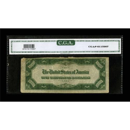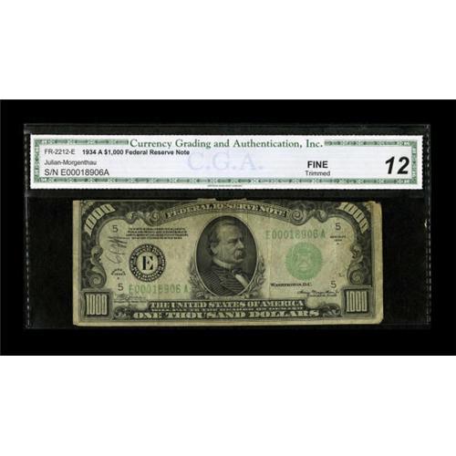 <B>Fr. 2212-E $1000 1934A Federal Reserve Note. CGA Fine 12 Trimmed.</B></I><BR> The top margin must have been rough as most of it has been trimmed away.<BR><BR><b>Shipping:</b> Coins & Currency (<a target="_blank" href="http://www.heritageauctions.com/common/shipping.php">view shipping information</a>)