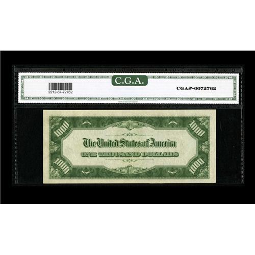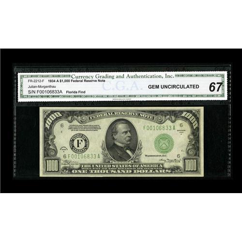 <B>Fr. 2212-F $1000 1934A Federal Reserve Note. CGA Gem Uncirculated 67.</B></I><BR>This is the loftiest graded "Florida Find" high denomination we have handled to date. The back centering is wonderful and the colors sharp on this $1000 Atlanta note.