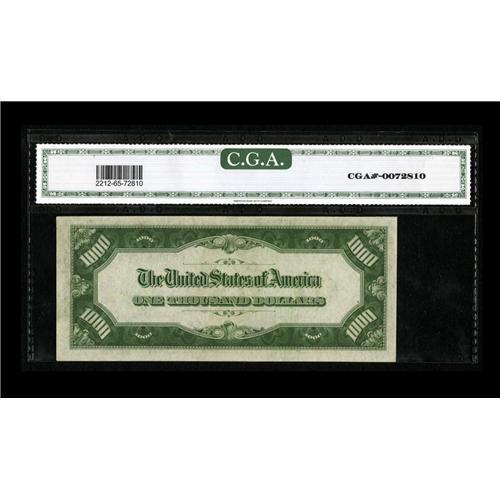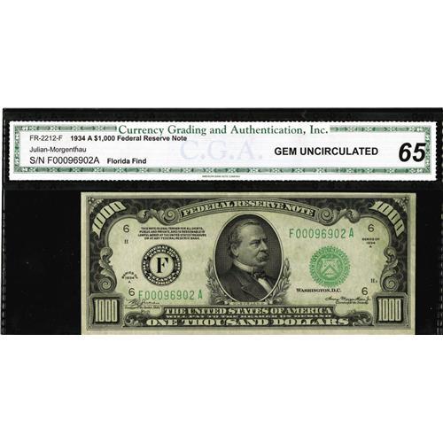 <B>Fr. 2212-F $1000 1934A Federal Reserve Note. CGA Gem Uncirculated 65.</B></I><BR>Embossing can be seen on this "Florida Find" note which simply was not as bright as its previous counterparts.
