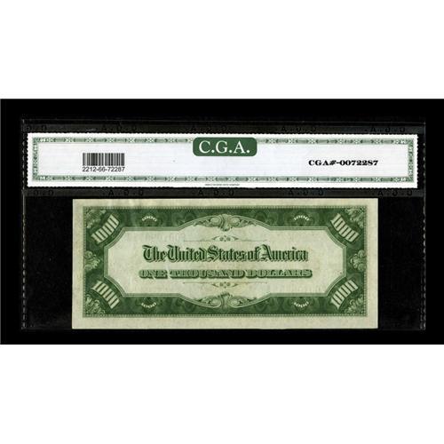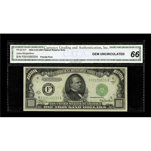 <B>Fr. 2212-F $1000 1934A Federal Reserve Note. CGA Gem Uncirculated 66.</B></I><BR>Two of the margins on this "Florida Find" note are much bigger than seen on most $1000's.<BR><BR><b>Shipping:</b> Coins & Currency (<a target="_blank" href="http://www.heritageauctions.com/common/shipping.php">view shipping information</a>)