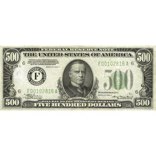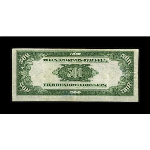 <B>Fr. 2202-F $500 1934A Federal Reserve Note. Extremely Fine.</B></I><BR>This note is bright with a small edge tear and paper disturbance near the left-hand edge.
