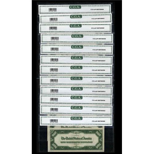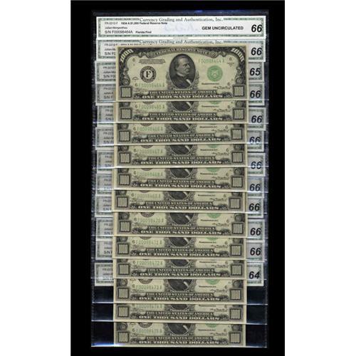 <B>Fr. 2212-F $1000 1934A Federal Reserve Notes. CGA Gem Uncirculated 66.</B></I><BR>A run of 12 consecutive notes from the "Florida Find" hoard. The first eleven pieces are well centered vividly colored examples housed in CGA Gem Uncirculated 66 holders save for one piece in a 65 holder, the last note is in a CGA Choice Uncirculated 64 holder.