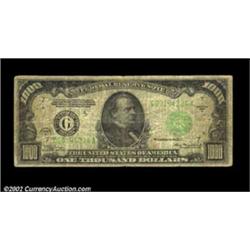 Fr. 2212-G $1,000 1934A Federal Reserve Note. Very Good.A well worn note that is fully intact but has a small "3" written in ink to the left of Cleveland's portrait. Important notice: We expect to be auctioning lots at the rate of 200-250 per hour. Sometimes eBay Premier live bid software cannot keep up with that pace, so we strongly recommend that you place a realistic proxy bid now as insurance to avoid disappointment. Also please note that all Heritage/CAA lots purchased through eBay Premier carry a 20% Buyer's Premium. Please make sure you read the Terms and Conditions.