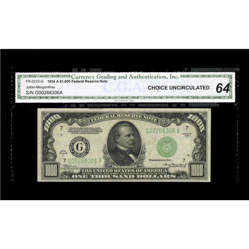 <B>Fr. 2212-G $1000 1934A Federal Reserve Note. CGA Choice Uncirculated 64.</B></I><BR>An attractive thousand encased in a CGA Choice Uncirculated 64 holder.