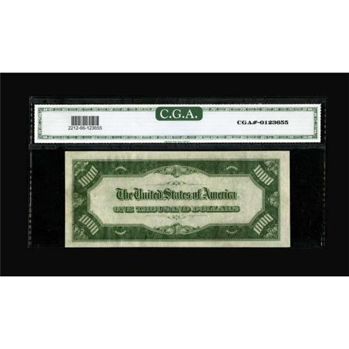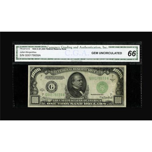 <B>Fr. 2212-G $1000 1934A Federal Reserve Note. CGA Gem Uncirculated 66.</B></I><BR> This bright and colorful example is well margined.<BR><BR><b>Shipping:</b> Coins & Currency (<a target="_blank" href="http://www.heritageauctions.com/common/shipping.php">view shipping information</a>)