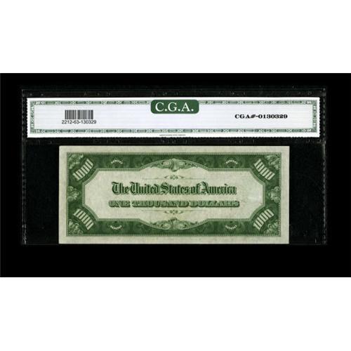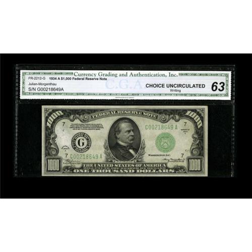 <B>Fr. 2212-G $1000 1934A Federal Reserve Note. CGA Choice Uncirculated 63.</B></I><BR> CGA has commented about writing that has been removed at left along with a stray pen mark in the same area. Otherwise, this note is well margined and nicely centered.<BR><BR><b>Shipping:</b> Coins & Currency (<a target="_blank" href="http://www.heritageauctions.com/common/shipping.php">view shipping information</a>)