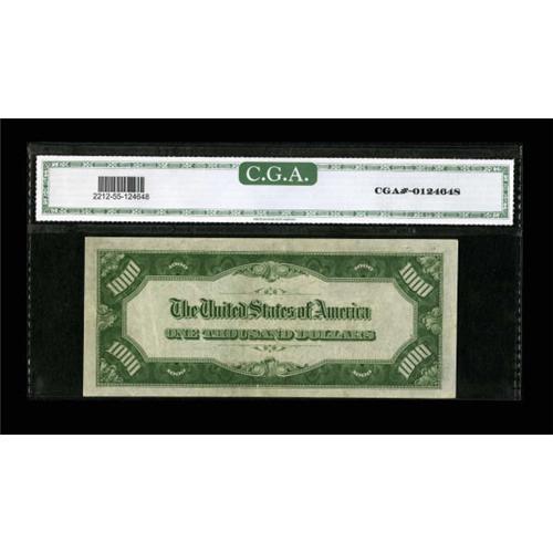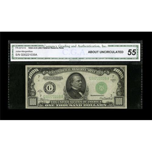 <B>Fr. 2212-G $1000 1934A Federal Reserve Note. CGA About Uncirculated 55.</B></I><BR> Here is a great opportunity to snare a lightly handled example of this high denomination note.<BR><BR><b>Shipping:</b> Coins & Currency (<a target="_blank" href="http://www.heritageauctions.com/common/shipping.php">view shipping information</a>)