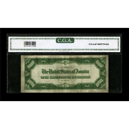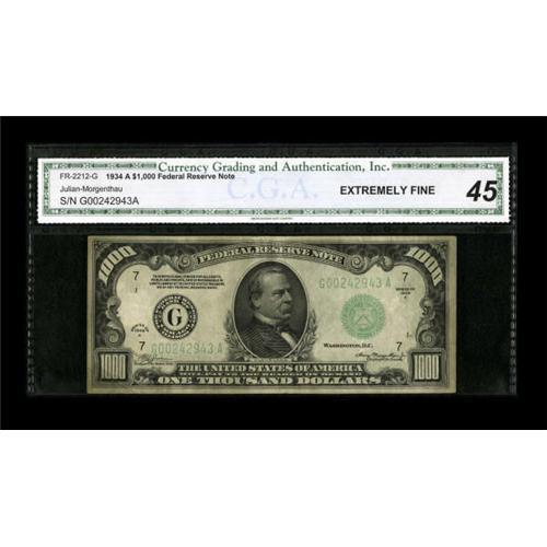 <B>Fr. 2212-G $1000 1934A Federal Reserve Note. CGA Extremely Fine 45.</B></I><BR> Three folds and some handling account for the grade on this problem-free note.<BR><BR><b>Shipping:</b> Coins & Currency (<a target="_blank" href="http://www.heritageauctions.com/common/shipping.php">view shipping information</a>)
