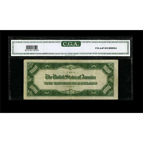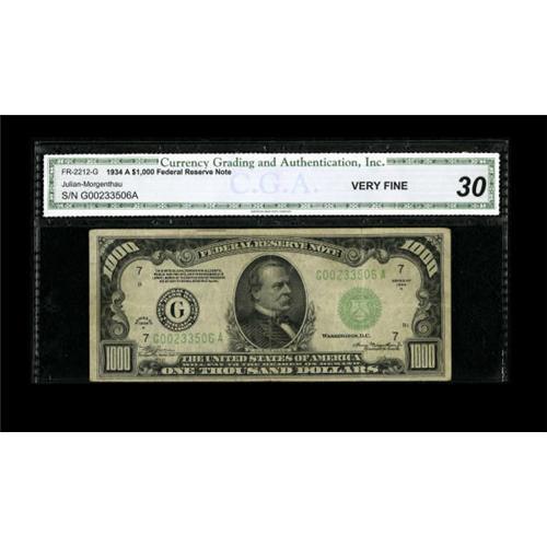 <B>Fr. 2212-G $1000 1934A Federal Reserve Note. CGA Very Fine 30.</B></I><BR> Bright inks remain on this nicely centered Chicago $1000 FRN.<BR><BR><b>Shipping:</b> Coins & Currency (<a target="_blank" href="http://www.heritageauctions.com/common/shipping.php">view shipping information</a>)