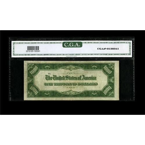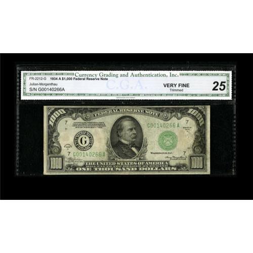 <B>Fr. 2212-G $1000 1934A Federal Reserve Note. CGA Very Fine 25 Trimmed.</B></I><BR> The top margin has been cut down a bit on this note.<BR><BR><b>Shipping:</b> Coins & Currency (<a target="_blank" href="http://www.heritageauctions.com/common/shipping.php">view shipping information</a>)