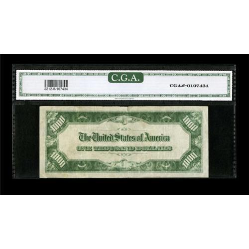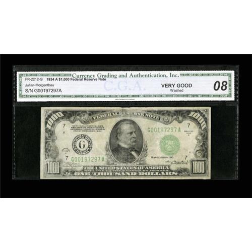 <B>Fr. 2212-G $1000 1934A Federal Reserve Note. CGA Very Good 08.</B></I><BR> CGA has commented that this note has been washed. Had some of the ink not eroded it would certainly be worthy of a higher grade.<BR><BR><b>Shipping:</b> Coins & Currency (<a target="_blank" href="http://www.heritageauctions.com/common/shipping.php">view shipping information</a>)