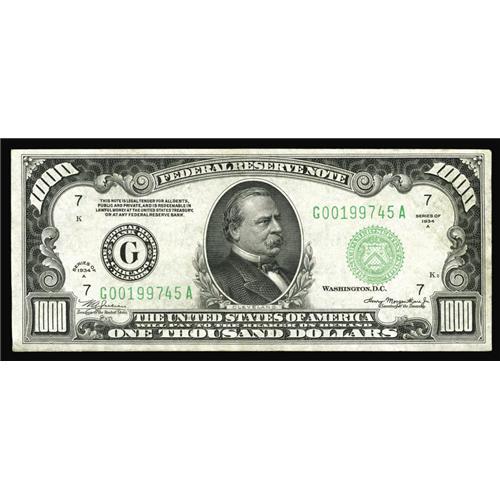 <B>Fr. 2212-G $1000 1934A Federal Reserve Note. Crisp Uncirculated.</B></I><BR>This is a nice high denomination example with one tiny split in the bottom margin.