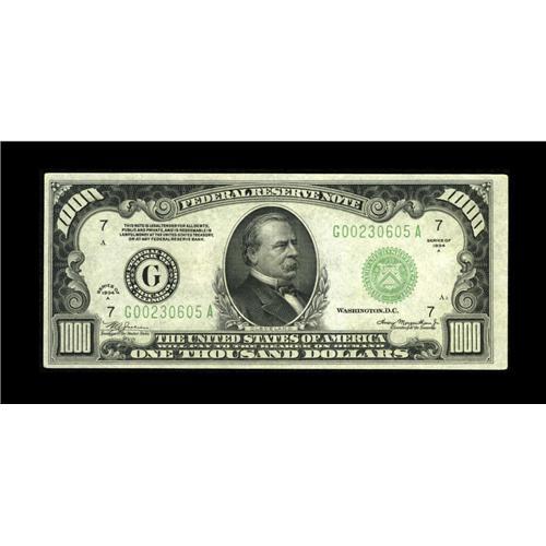 <B>Fr. 2212-G $1000 1934A Federal Reserve Note. Extremely Fine-About Uncirculated.</B></I><BR>A more than acceptable high grade specimen which is far closer to the higher grade than the lower.<BR><BR><b>Shipping:</b> Coin/Currency (<a target="_blank" href="http://www.heritageauctions.com/common/shipping.php">view shipping information</a>)