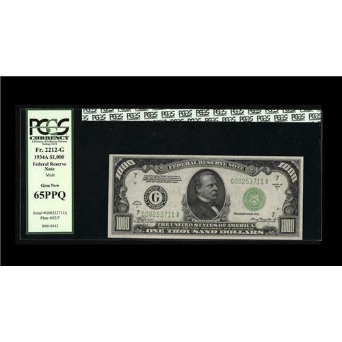 <B>Fr. 2212-G $1000 1934A Federal Reserve Note. PCGS Gem New 65PPQ.</B></I><BR>This Chicago Grand possesses even margins with excellent back centering. A popular note in a wonderful grade.
