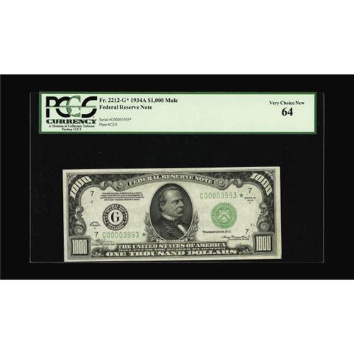 <B>Fr. 2212-G* $1000 1934A Federal Reserve Note. PCGS Very Choice New 64.</B></I><BR>Five high denomination star notes are currently listed in the census, of which this is one. The vivid printing and great centering have earned this note a lofty grade. One of the very nicest examples out there and certainly able to produce inspired bidding. This note should finish in the area of...