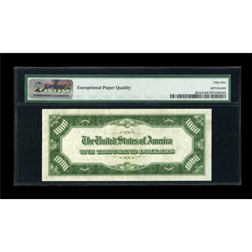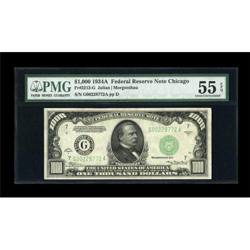 <B>Fr. 2212-G $1000 1934A Federal Reserve Note. PMG About Uncirculated 55 EPQ.</B></I><BR> The first note from a consecutive hoard of six AU notes. Colorful and fresh with pleasing contrast, even margins and excellent centering.<BR><BR><b>Shipping:</b> Coins & Currency (<a target="_blank" href="http://www.heritageauctions.com/common/shipping.php">view shipping information</a>)