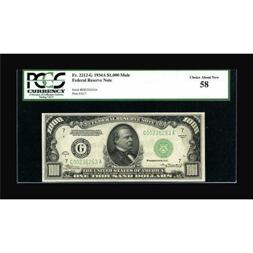 <B>Fr. 2212-G $1000 1934A Federal Reserve Note. PCGS Choice About New 58.</B></I><BR> A nicely centered high grade thousand which is a fold away from the full Choice Uncirculated grade.<BR><BR><b>Shipping:</b> Coins & Currency (<a target="_blank" href="http://www.heritageauctions.com/common/shipping.php">view shipping information</a>)