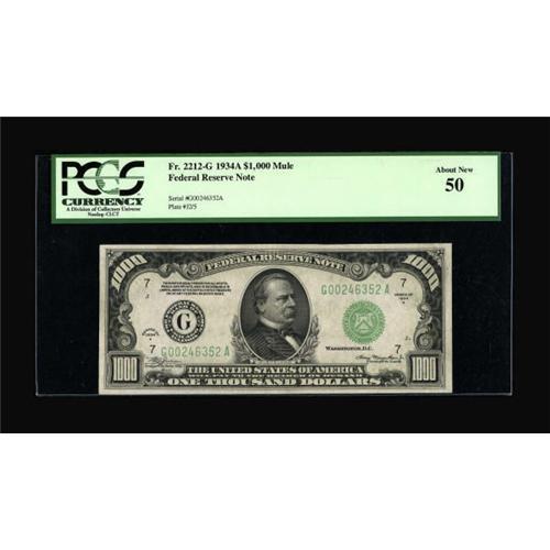 <B>Fr. 2212-G $1000 1934A Federal Reserve Note. PCGS About New 50.</B></I><BR> This pleasing well margined note is deeply inked.<BR><BR><b>Shipping:</b> Coins & Currency (<a target="_blank" href="http://www.heritageauctions.com/common/shipping.php">view shipping information</a>)