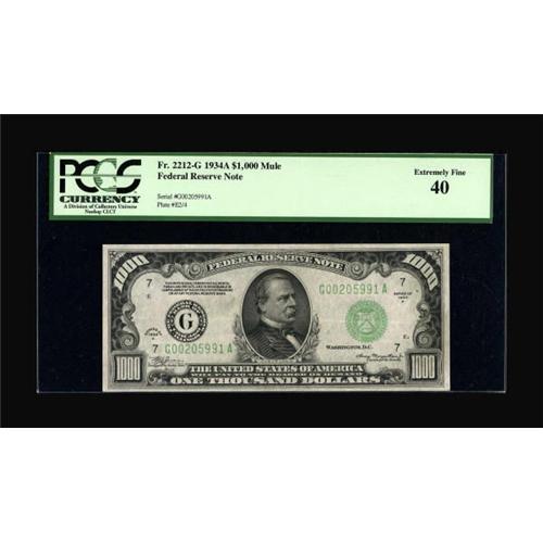 <B>Fr. 2212-G $1000 1934A Federal Reserve Note. PCGS Extremely Fine 40.</B></I><BR> A center fold and corner tip fold are noted, but do not detract from the overall uncirculated appearance of the note.<BR><BR><b>Shipping:</b> Coins & Currency (<a target="_blank" href="http://www.heritageauctions.com/common/shipping.php">view shipping information</a>)