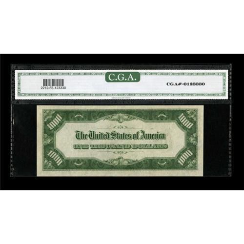 <B>Fr. 2212-G* $1000 1934A Federal Reserve Note. CGA Gem Uncirculated 65.</B></I><BR> This is a rare replacement for the issue as less than ten examples are known. Uncommon in this state of preservation, this is the first of a consecutive pair with vivid inks and decent margins.<BR><BR><b>Shipping:</b> Coins & Currency (<a target="_blank" href="http://www.heritageauctions.com/common/shipping.php">view shipping information</a>)
