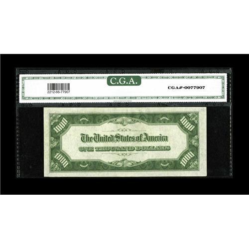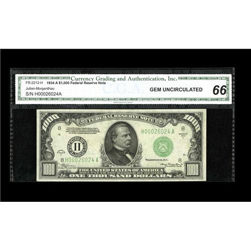 <B>Fr. 2212-H $1000 1934A Federal Reserve Note. CGA Gem Uncirculated 66.</B></I><BR>A nicely centered St. Louis $1000 in a CGA Gem Uncirculated 66 holder.